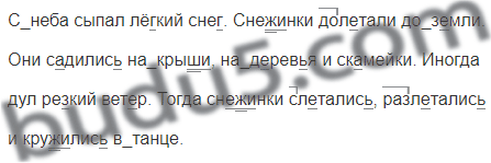 (С)неба сыпал лёгкий снег. Снежинки (до)летали (до)земли. Они садились (на)крыши, (на)деревья и скамейки. Иногда дул резкий ветер. Тогда снежинки (с)летались, (раз)летались и кружились (в)танце.