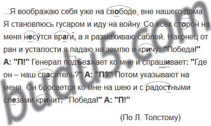 ...Я воображаю себя уже на св_боде, вне нашего дома. Я становлюсь гусаром и иду на войну. Со всех ст_рон на меня н_сутся вр_ги а я размахиваю саблей. Наконец от ран и усталости я падаю на землю и кр_чу (Победа!) Генерал под_е_жает ко мне и спраш_вает (Где он – наш сп_ситель?) Потом указывают на меня. Он бросается ко мне на шею и с радос_ными сл_зами кр_чит (Победа!)