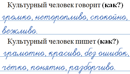 Культурный человек пишет (как?) грамотно, красиво, без ошибок, чётко, понятно, разборчиво.