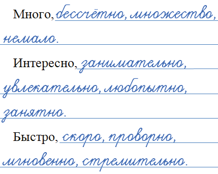 Распределите слова в три группы: найдите синонимы к словам много, интересно, быстро.