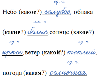 Небо (какое?) ___ , облака (какие?) ___ , солнце (какое?) ___ , ветер (какой?) ___ , погода (какая?) ___ .