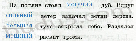 На поляне стоял ___ дуб. Вдруг ___ ветер закачал ветви дерева. ___ туча закрыло небо. Раздался ___ раскат грома.