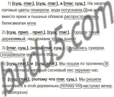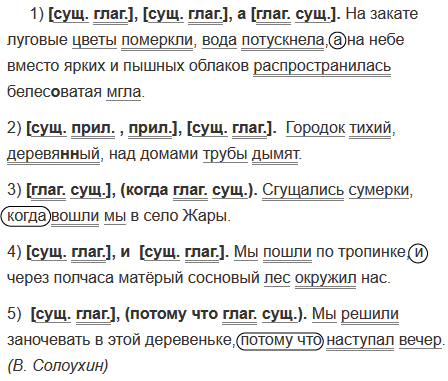 1) На закате луговые цветы померкли вода потускнела а на небе вместо ярких и пышных облаков распространилась белес..ватая мгла. 2) Городок тихий, деревя(н, нн)ый над домами трубы дымят. 3) Сгущались сумерки когда вошли мы в село Жары. 4) Мы пошли по тропинк и через полчаса матёрый сосновый лес окружил нас. 5) Мы решили заночевать в этой деревеньке потому что наступал вечер. (В. Солоухин)