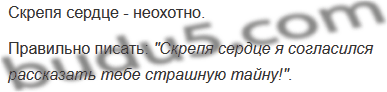 Ученик писал другу записку и задумался, как написать правильно: "Скрепя сердцем... или скрипя сердцем... или скрепя сердце я согласился рассказать тебе страшную тайну!» Помогите ученику написать записку без ошибок. Объясните написание.