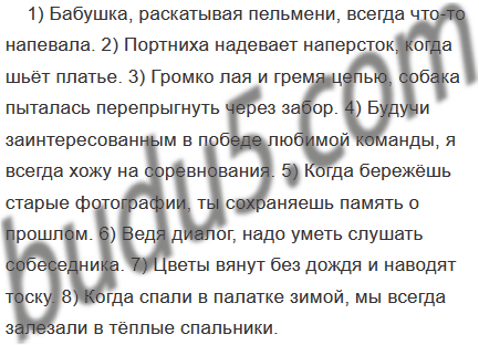 1) Бабушка (раскатывать пельмени) всегда что-то напевала. 2) (Шить платье) портниха надевает наперсток. 3) (Громко лаять и греметь цепью) собака пыталась перепрыгнуть через забор. 4) (Быть заинтересованным в победе любимой команды) я всегда хожу на соревнования. 5) (Беречь старые фотографии) ты сохраняешь память о прошлом. 6) (Вести диалог) надо уметь слушать собеседника. 7) Цветы (вянуть без дождя) наводят тоску. 8) (Спать в палатке зимой) мы всегда залезали в тёплые спальники.
