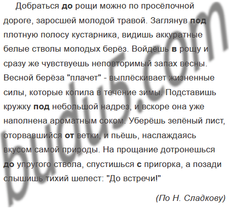 Добраться ... рощи можно по просёлочной дороге, заросшей молодой травой. Заглянув ... плотную полосу кустарника, видишь аккуратные белые стволы молодых берёз. Войдёшь ... рощу и сразу же чувствуешь неповторимый запах весны. Весной берёза "плачет" - выплёскивает жизненные силы, которые копила в течение зимы. Подставишь кружку ... небольшой надрез, и вскоре она уже наполнена ароматным соком. Уберёшь зелёный лист, оторвавшийся ... ветки, и пьёшь, наслаждаясь вкусом самой природы. На прощание дотронешься ... упругого ствола, спустишься ... пригорка, а позади слышишь тихий шелест: "До встречи!"