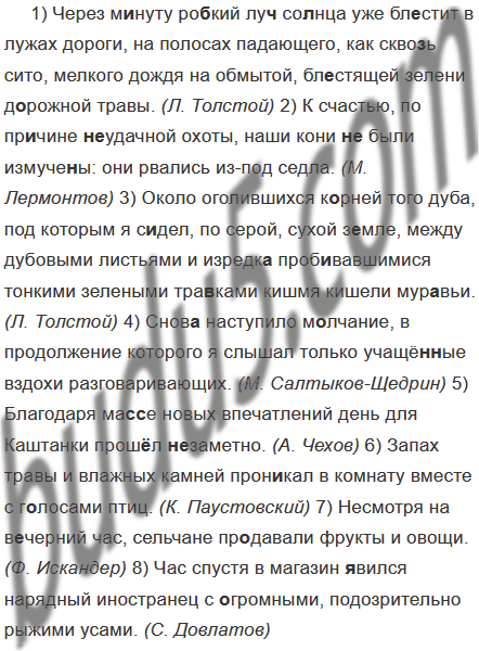 1) Через м..нуту ро(б,п)кий луч(?) со(?)нца уже бл..стит в лужах дороги, на полосахпадающего, как скво(з,с)ь сито, мелкого дождя на обмытой, бл..стящей зелени д..рожной травы. (Л. Толстой) 2) К счастью, по пр..чине (не)удачной охоты, наши кони (не)были измуче(н,нн)ы: они рвались из-под седла. (М. Лермонтов) 3) Около оголившихся к..рней того дуба, под которым я с..дел, по серой, сухой з..мле, между дубовыми листьями и изредк.. проб..вавшимися тонкими зелеными тра(в, ф)ками кишмя кишели мур..вьи. (Л. Толстой) 4) Снов.. наступило м..лчание, в продолжение которого я слышал только учащё(н, нн)ые вздохи разговаривающих. (М. Салтыков-Щедрин) 5) Благодаря ма(с, сс)е новых впечатлений день для Каштанки прош..л (не)заметно. (А. Чехов) 6) Запах травы и влажных камней прон..кал в комнату вместе с г..лосами птиц. (К. Паустовский) 7) Несмотря на в..черний час, сельчане пр.. давали фрукты и овощи. (Ф. Искандер) 8) Час спустя в магазин ..вился нарядный иностранец с ..громными, подозрительно рыжими усами. (С. Довлатов)