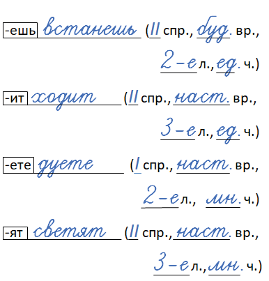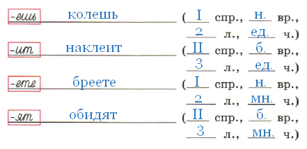 Прочитайте. Подберите глаголы, которые могут иметь данные окончания. Запишите их. Рядом с каждым глаголом в скобках укажите спряжение, время, лицо и число.
