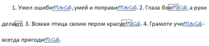 1. Умел ошиби__, умей и поправи__. 2. Глаза боя__, а руки делают. 3. Всякая птица своим пером красуе__. 4. Грамоте учи__ - всегда пригоди__.