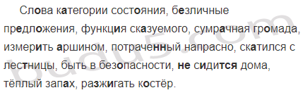 Сл..ва к..тегории сост..яния, б..зличные пр..дл..жения, функц..я ск..зуемого, сумр..чная гр..мада, измер..ть ..ршином, потраче(н, нн)ый напрасно, ск..тился с лес..ницы, быть в без..пасности, (не)с..дит(?)ся дома, тёплый зап..х, ра..ж..гать к..стёр.