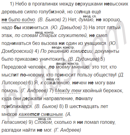 1) Небо в прогалинах между в..рхушками (не)высоких деревьев сияло голуб..зной но со..нца ещё (не)было видно. (В. Быков) 2) Нет думаю (не)хорошо надо(бы) изв..ниться. (Ю. Давыдов) 3) На этот пятый этаж по словам старых служителей (не)смел подн..маться без вызова (н..)один из учащихся. (Ю. Домбровский) 4) По решению коми(с, сс)ии документы было приказа(н, нн)о уничтожить. (В. Дудинцев) 5) Передовой человек (по)моему мнению это тот кто мысл..т (по)новому кто пр..носит пользу обществу! (Д. Липскеров) 6) Я к сож.лению (н..)чем (н..)могу вам помочь. (Г. Андреев) 7) Между тем хвойный бережок куда они д..ржали направление (по)малу пр..ближался. (В. Быков) 8) В шес..надцать лет многое кажет(?)ся см..шным. (А. Геласимов) 9) Словом сколько я (н..)ломал голову разгадки найти (н..)мог. (Г. Андреев)