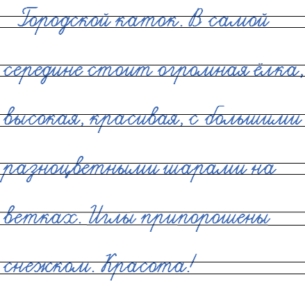 На главном катке города поставили пушистую ёлку. Каждый принёс игрушку, сделанную своими руками: кто-то сшил мишку или куклу, мальчишки смастерили машинки и паровозы, малыши изготовили бусы и снежинки. Украшали ёлочку всей гурьбой. Затем дети надели коньки и стали кататься вокруг нарядной красавицы. Никогда еще катание на коньках не было таким весёлым!