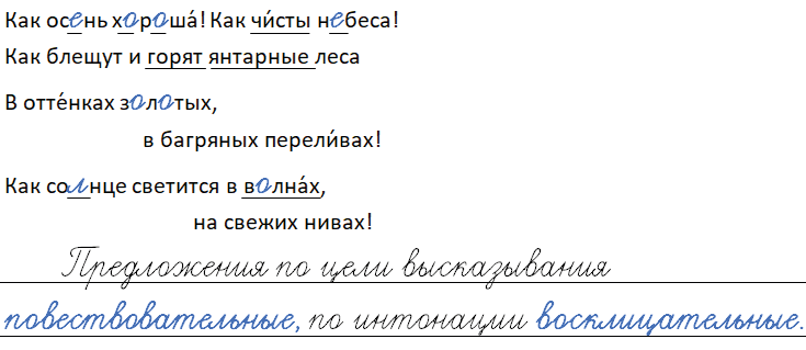 Автор использует большое количество восклицательных предложений, чтобы передать своё отношение к осенней поре.