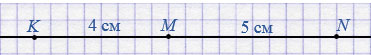 Проведите прямую и постройте на ней отрезок МN длиной 5 см. Отложите на прямой отрезок МK длиной 4 см так, чтобы точки N и K были по разные стороны от точки М. Есть ли на прямой МK точка, находящаяся от точки N на расстоянии 1 км?