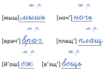 Произнесите слова. Замените звуковые обозначения слов буквенными. Укажите род имён существительных.
