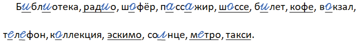 Б_бл_отека, рад_о, ш_фёр, п_сс_жир, ш_ссе, б_лет, кофе, в_кзал, т_л_фон, к_ллекция, эскимо, со_нце, м_тро, такси.