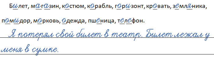 Б_лет, м_г_зин, к_стюм, к_рабль, г_р_зонт, кр_вать, з_мл_ника, п_м_дор, м_рковь, _дежда, пш_ница, т_л_фон.