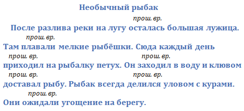1. После, реки́, разли́ва, на, осталась, лужица2, большая, лугу. 2. Рыбёшки, там, плавали, мелкие. 3. Сюда, день, каждый, петух, приходил, рыбалку, на. 4. Доставал, в, он, заходил, и, рыбу, клювом, воду. 5. Всегда, уло́вом, с, курами, делился, рыбак. 6. Они, на, ожидали, берегу́, угощение.